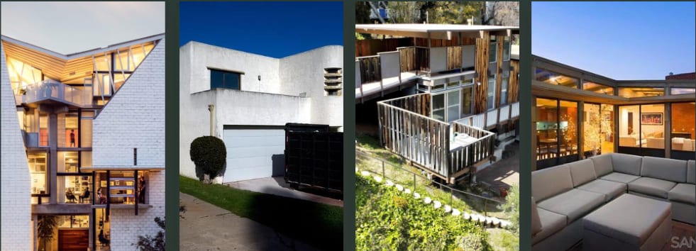 Mid-Century Modern: La Jolla, Point Loma, Del Cerro, Clairemont, University City, Mt. Helix, Pacific Beach and Del Mar Heights all have many mid-century modern homes.
